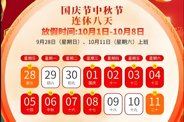 國慶節(jié)放假安排:10月1日(周三)至8日(周三)放假調(diào)休,共8天。9月28日(周日)、10月11日(周六)上班。